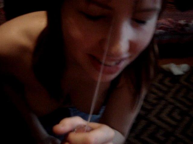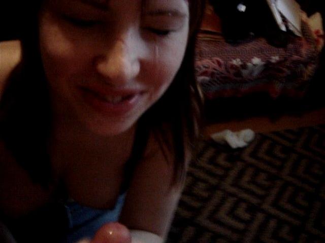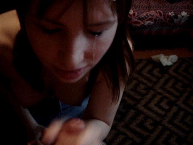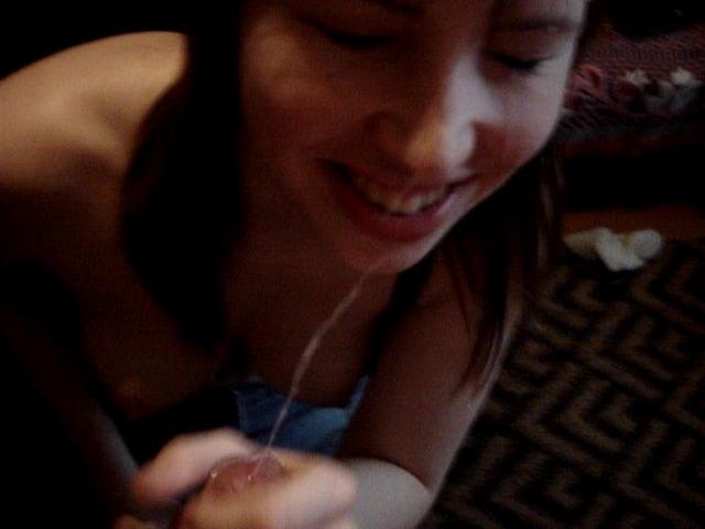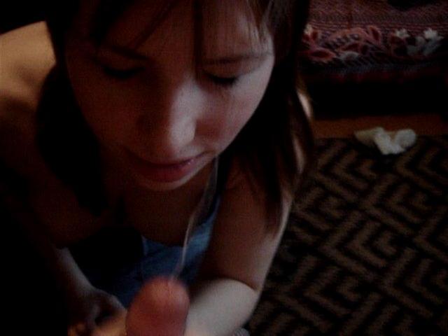 Домашний архив одной молодой семейной парочки. Парень не вынимая камеры из рук, пялит свою темноволосую подругу в ротик, снимая всё очень крупным планом. Красотка, конечно же, очень сильно старается сделать все профессионально и поэтому в итоге на нее изливается целый водопад липкой спермы.